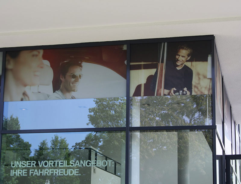 High-level window friezes had to achieve multiple goals: catch the eye of passing motorists; look great close-up inside the showroom; let light flood in; resist fading and peeling from northern Norway to southern Spain; and be applicable inside and outside.