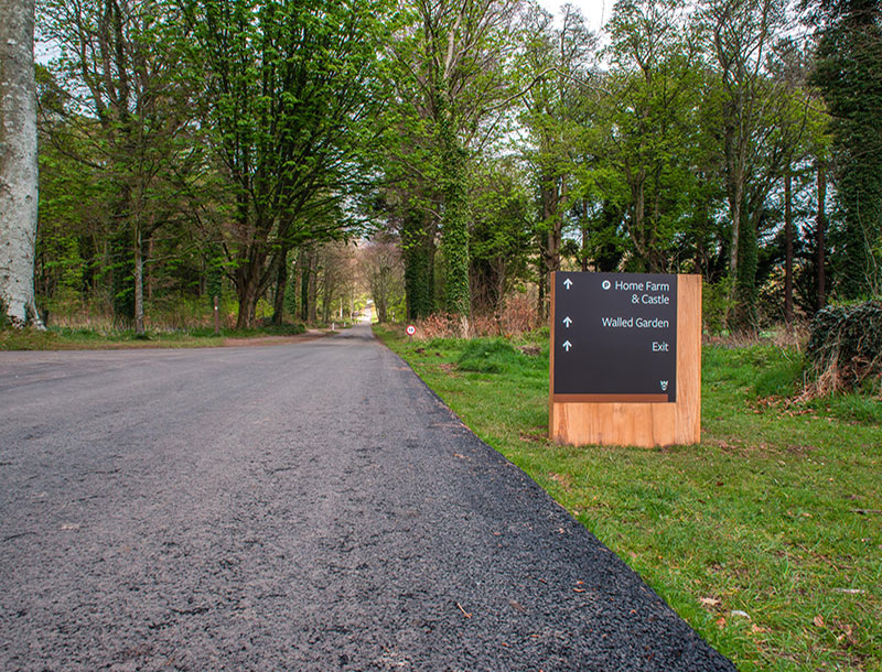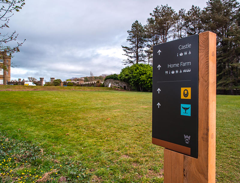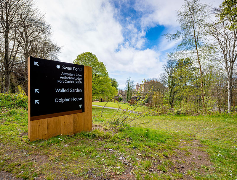 Overlooking the Firth of Clyde, the Castle – former home to the Marquess of Ailsa – is situated on a prestigious and opulent estate. It was therefore crucial that the signage would enhance the visitor experience from the minute of arrival. But the interpretative element of the graphical displays hasn’t been the only consideration. The beach location – whilst picturesque – means the external signs will be subject to extreme weather conditions during their lifespan.