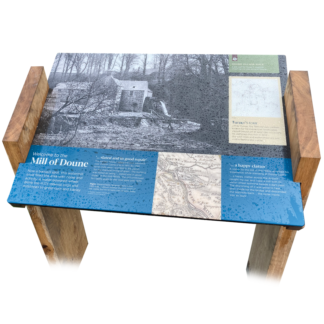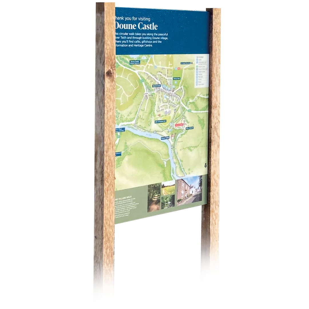 We sourced a large quantity of European kiln-dried Oak to create waymarker and finger posts to help visitors navigate their way around Doune, the castle and its nature reserve. As many veteran trees around the monument are old Oaks pre-dating the 18th century, the addition of our Oak wayfinding signs was harmonious with the very essence of Doune. A custom-engraved timber lectern emblazoned with “Doune Historic Village” was created, much to the satisfaction of HES. A collection of interpretation boards manufactured from our “Vault” panels was also supplied, a robust, vandal-resistant external signage system which brings stunning photographic quality to outdoor graphics. Completing the project, a double-sided welcome sign now marks the entrance to the Castle to greet its thousands of annual visitors in style.