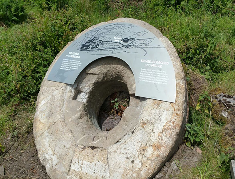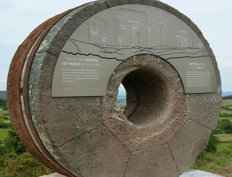 The sites at Tankerville Mine and Snailbeach offer information about the hive of activity that could once be seen in the now disused and ruined buildings. At the site in Cothercott, the panels provide insight into what can no longer be seen in the landscape. Using the only clues left of the Barytes Mill that once stood here, some of the panels are designed as etched, stainless steel arcs, mounted to millstones left littered in the landscape, evoking the industrial nature of the site.
