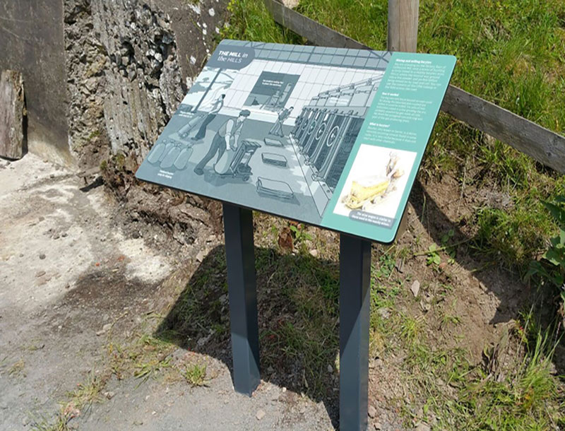 The graphic style of the panels varied between the sites, designed to complement the surrounding landscape and enhance the specific assets utilised such as a reconstruction CGI model of the mine at Tankerville, provided by a local volunteer.