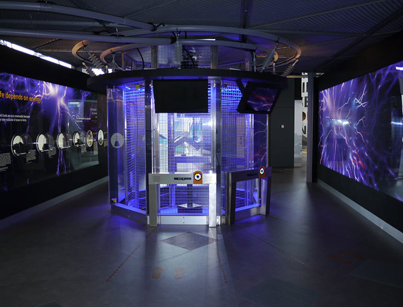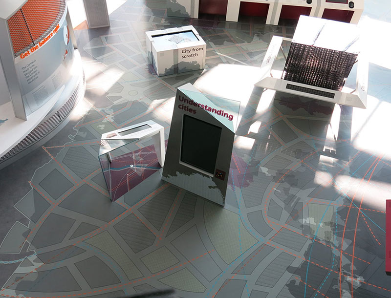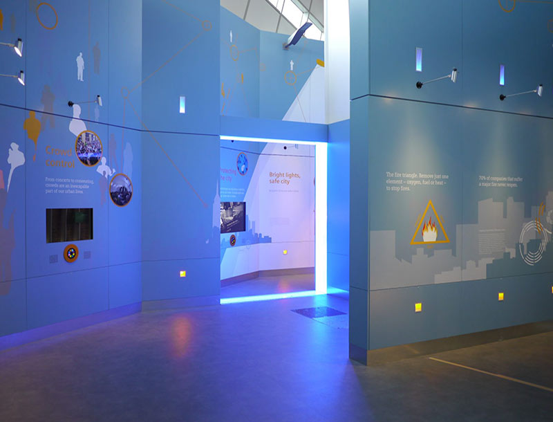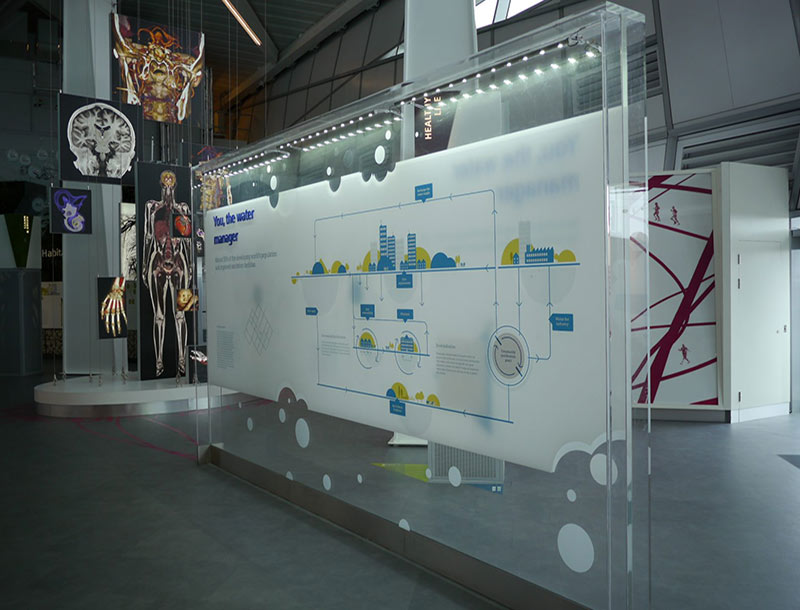 An array of double-sided hanging Vision LED lightboxes, displayed artistically to represent the human body, is a triumph of technical simplicity: the hanging wires double as low-voltage power cables. Our unique on-site screenprinting and stencilling cover walls in nine colours, while a permanent floor graphic spreads across a huge 350m2. A single-piece of Titan wallpaper, another of Leach’s unique products, covers several of the curved display walls – the absence of joins not only enhancing the quality but providing superb durability for an exhibition with such high footfall.