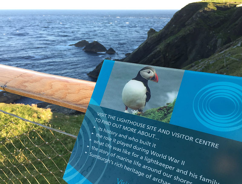 Leach researched, created content, designed and manufactured a trail of panels for the outdoor environment from the remote car park to encourage visitors to take the short, but steep, walk to Sumburgh Head Lighthouse. More than 20 people were part of a multi-disciplinary project team.
