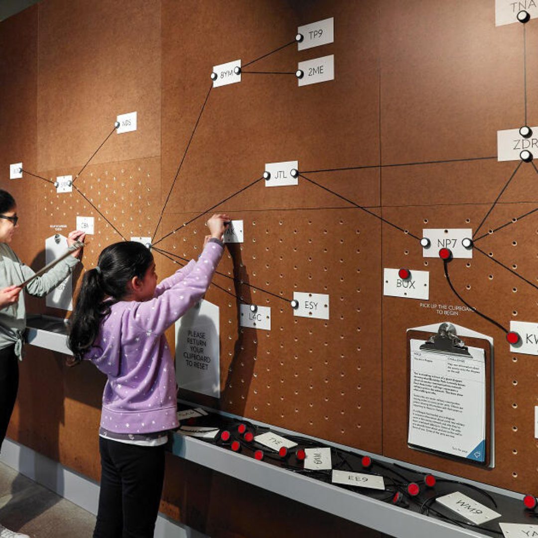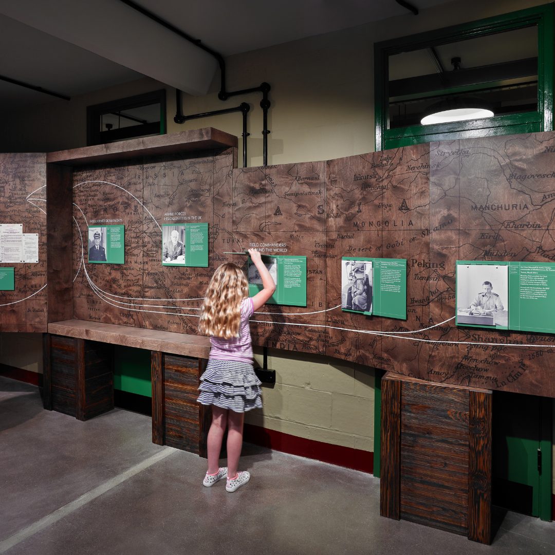 These MDF panels resembled maps, overlaid with projected graphics and a complex array of strings and map pins to help visitors track the changing course of WWII. Our team followed detailed instructions upon installation to ensure background artwork, maps, and projected images would align.