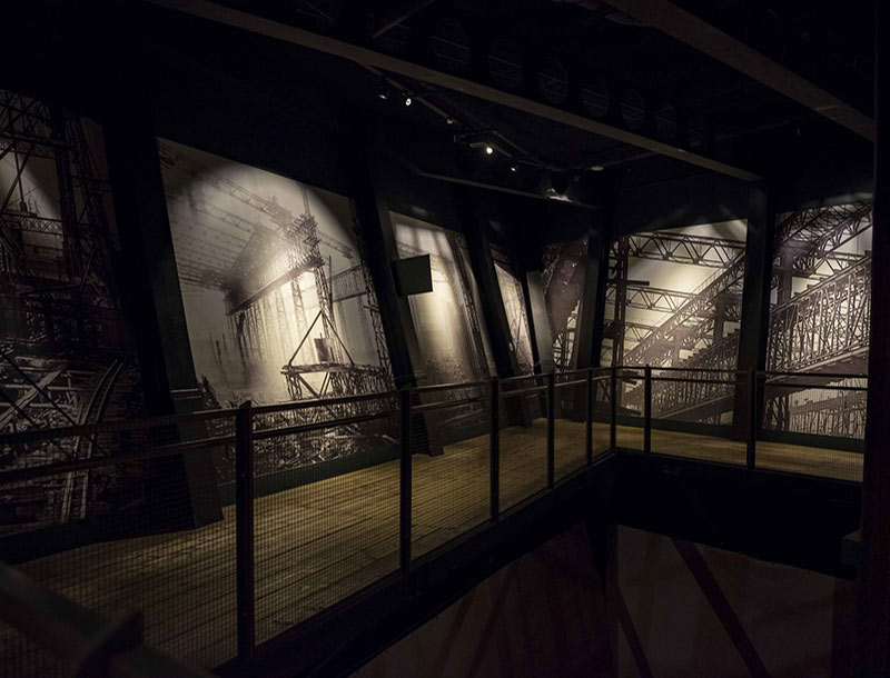 In addition to the Titan wall-covering, bold iconography and recognizable quotations were screen printed directly to the gallery walls or hewn from solid materials and fixed directly. Interactive window graphics were also provided, and as such we developed a method for printing and applying piezo-LCD film to the windows. These graphics depict the before and after shots of the historic ship leaving its birth, switching seamlessly from a view of the slipway to an intimate education space – all of which enhances the visitor experience.