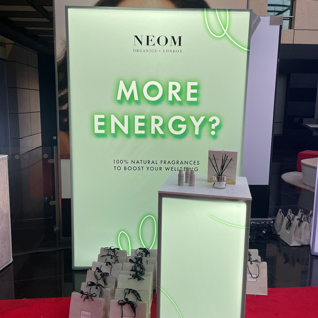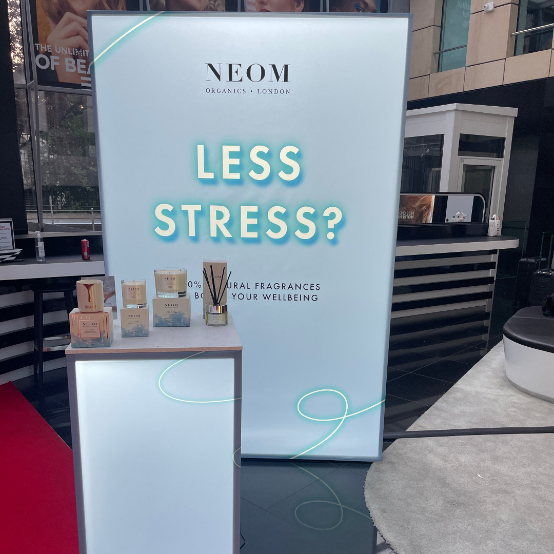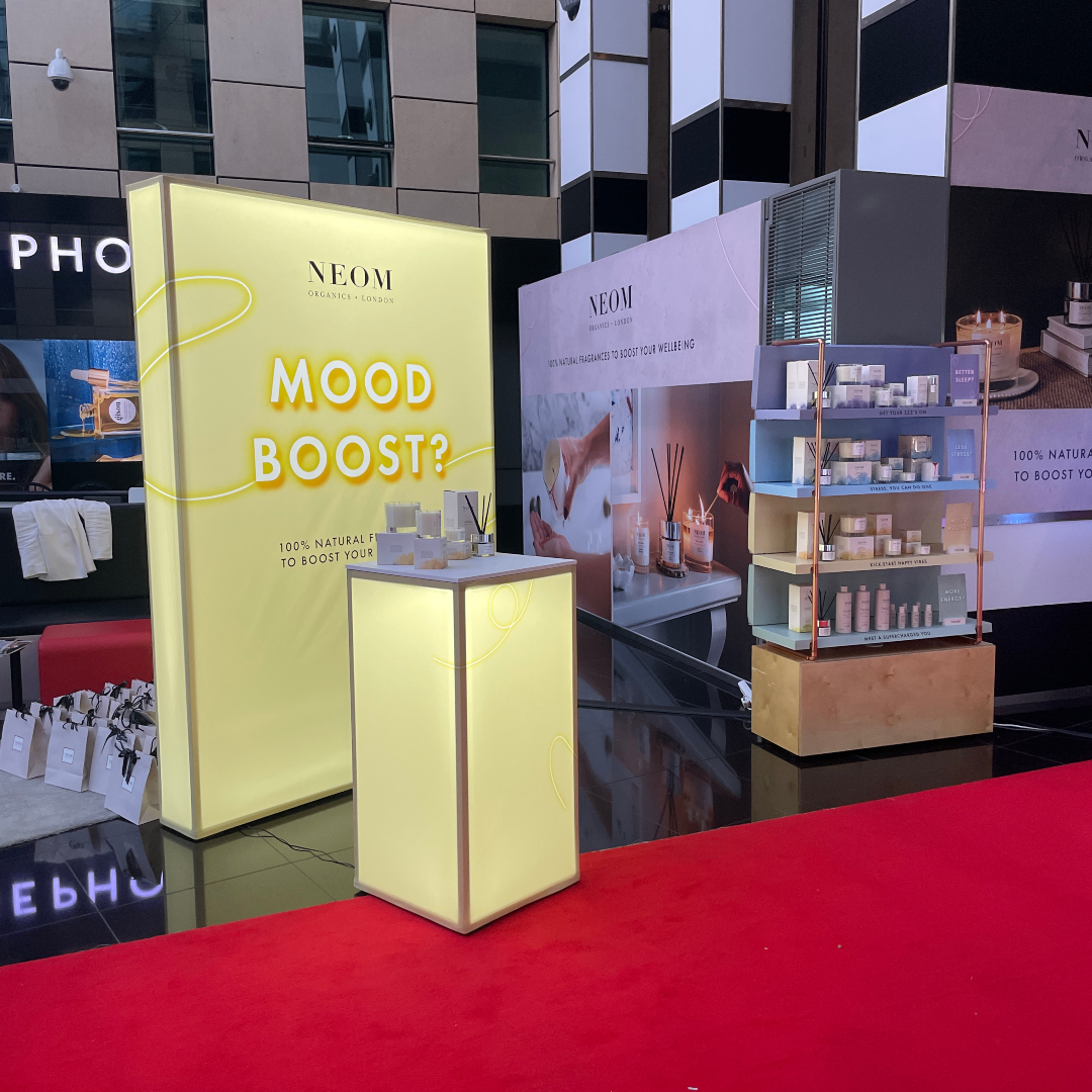To complete the pop-up event installation, a large 3830mm wide x 2460mm high frontlit lightbox was added to act as an attention-grabbing backdrop to the NEOM Organics space.