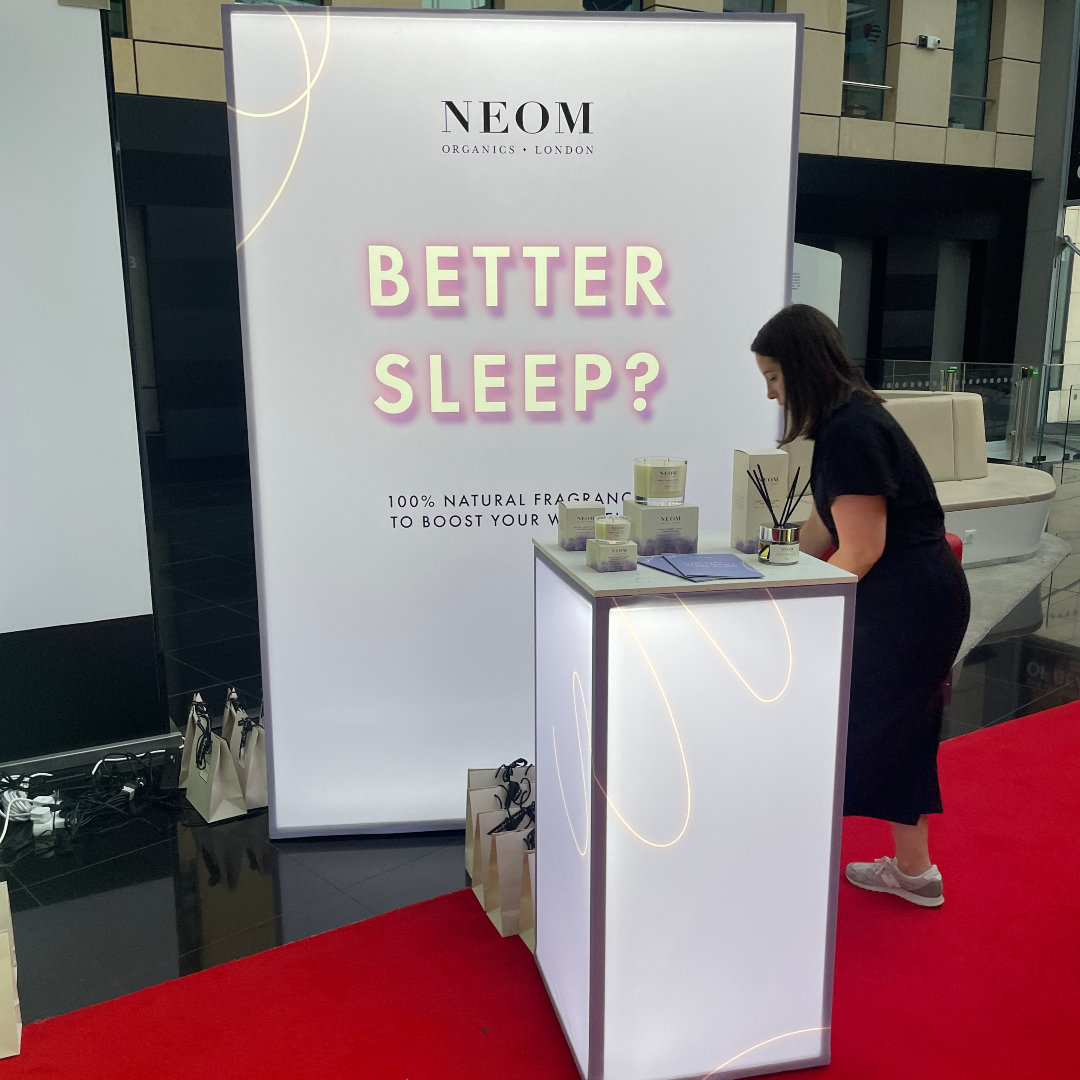 Four 1500mm wide x 2250mm high VF360 frames and graphics were crafted in pastel colours, each displaying one of the four “wellbeing needs” that NEOM Organics cater to; Better Sleep, Less Stress, Mood Boost and More Energy. An additional four plinth tabletop variants of the VF360 were produced at 497mm wide x 1000mm high, offering the NEOM Organics team a practical space to display products and goody bags with no detriment to the theme or aesthetics of the overall display.