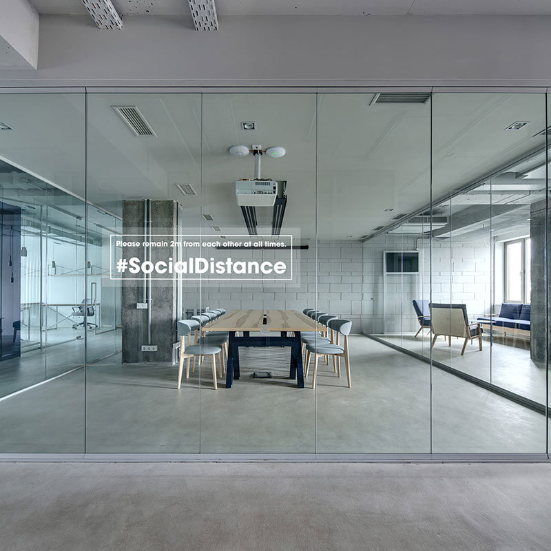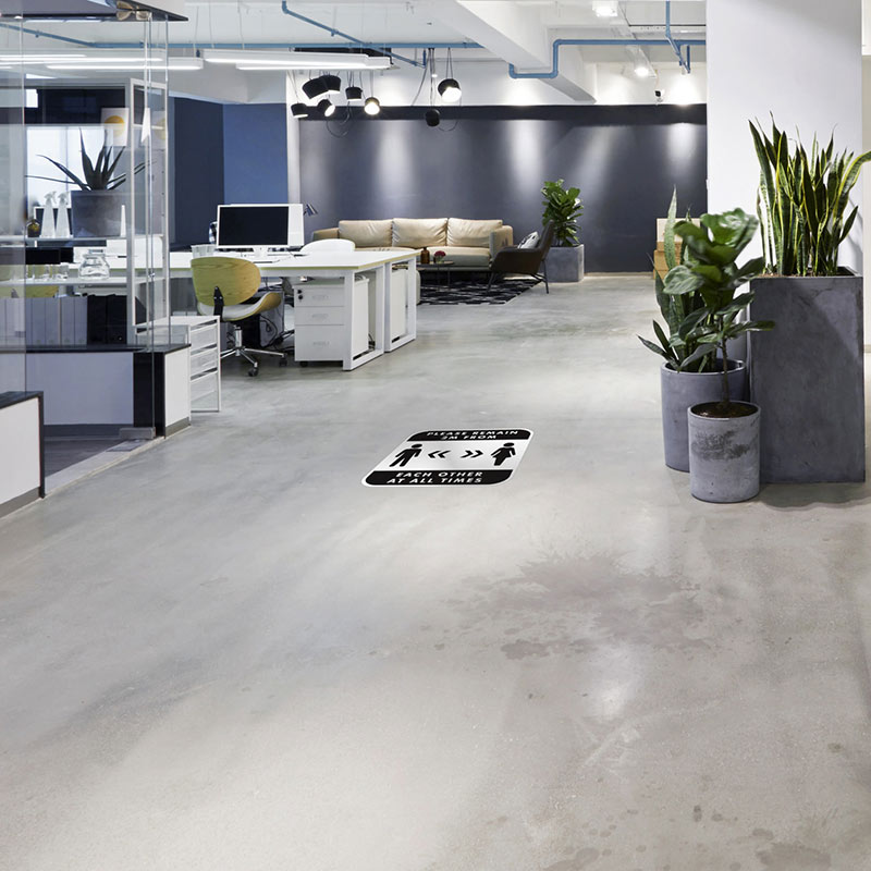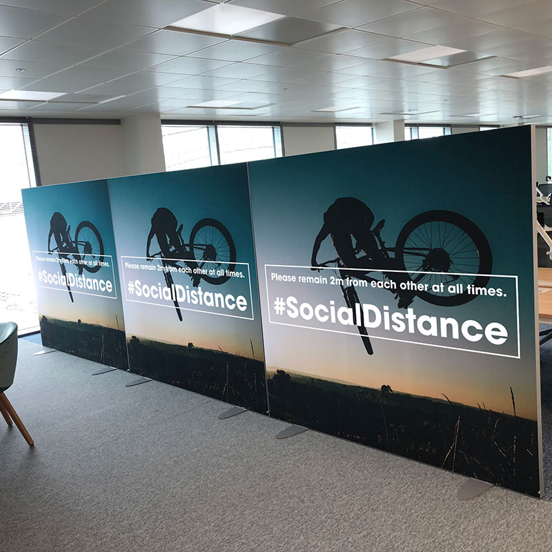 Branded hand sanitising stations, floor graphics and walkways – as well as clear wayfinding signage coordinating new routes through the building – will all prove central for a safe, and welcomed, return to the office.